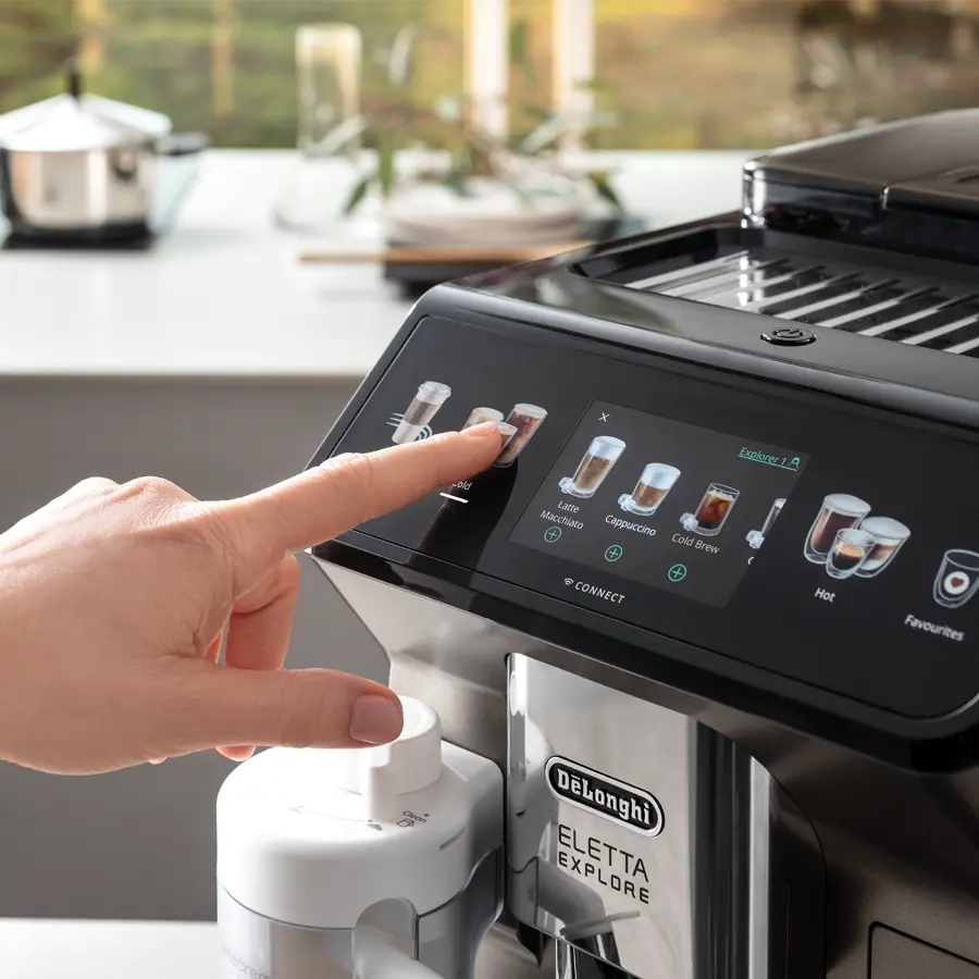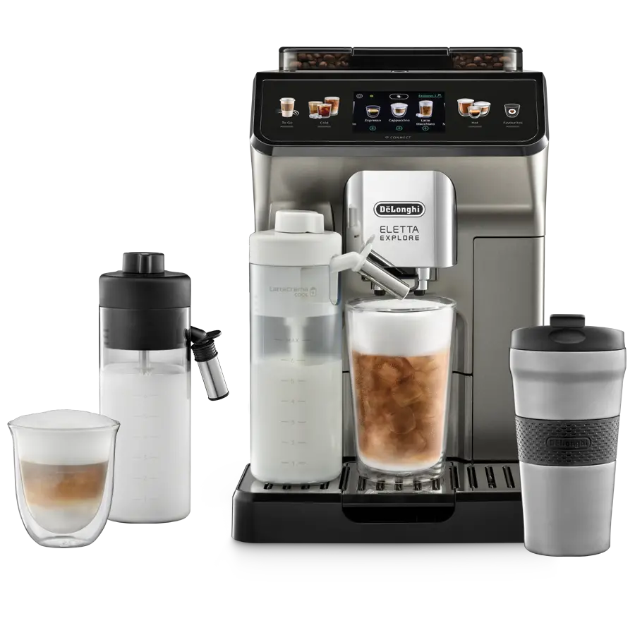 Ön kısmı titanyum boyalı De'Longhi Eletta Explore otomatik kahve makinesiyle 50'den fazla sıcak, soğuk ve soğuk demlenmiş içecek. LatteCrema Hot Teknolojisi* sayesinde otomatik sıcak süt köpüğünün, LatteCrema Cool* ve Cold Extraction Teknolojileri ile serinletici soğuk ve Cold Brew kahve içeceklerinin keyfini çıkarın. To-Go işleviyle evde ve hareket halindeyken kendi cafenizins keyfini çıkarın.